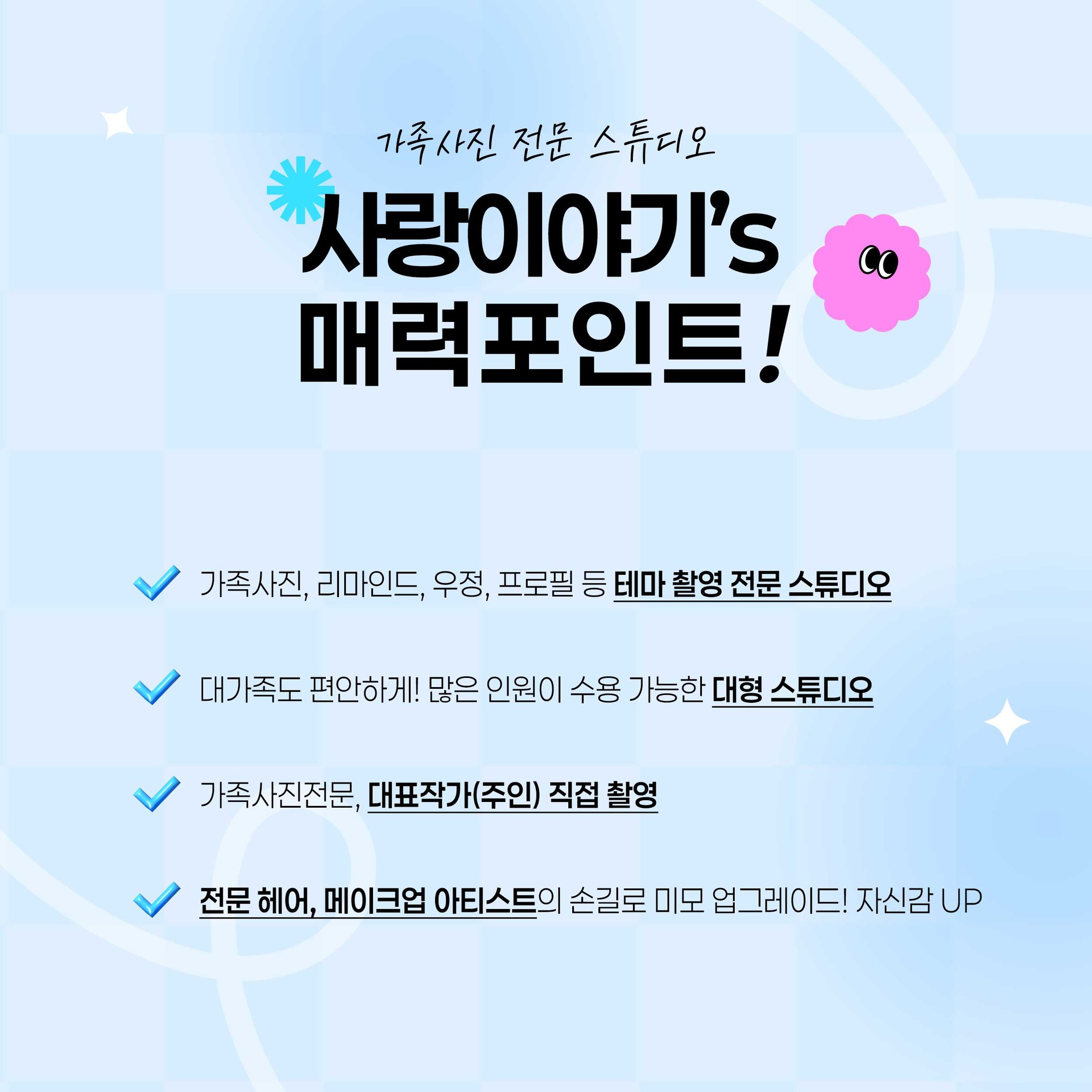 사랑이야기스튜디오는 가족사진, 리마인드웨딩, 프로필사진 등을 최고 순간의 사진으로 담아드립니다.